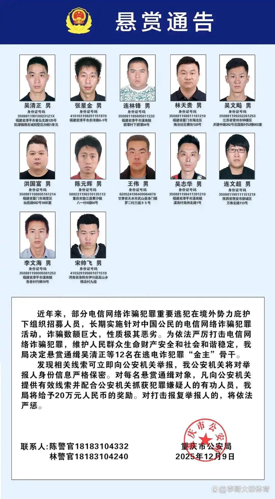 发现相关线索可立即向公安机关举报,我公安机关将对举报人身份信息严格保密。对每名悬赏通缉对象,凡向公安机关提供有效线索并配合公安机关抓获犯罪嫌疑人的有功人员,我局将给予20万元人民币的奖励。对打击报复举报人的,将依法严惩。