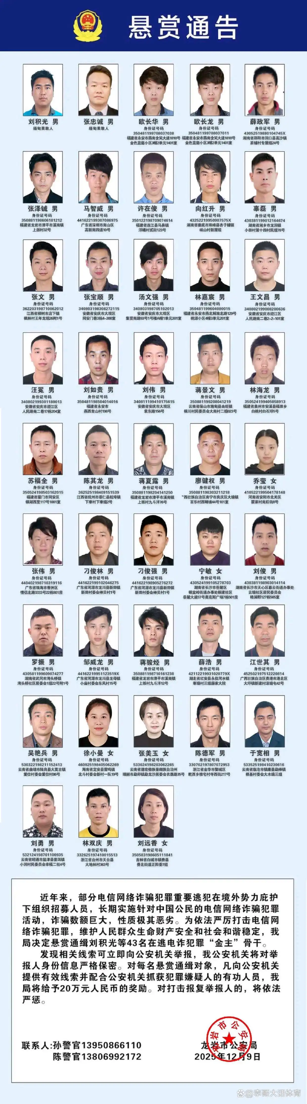 近年来,部分电信网络诈骗犯罪重要逃犯在境外势力庇护下组织招募人员,长期实施针对中国公民的电信网络诈骗犯罪活动,诈骗数额巨大,性质极其恶劣。为依法严厉打击电信网络诈骗犯罪,维护人民群众生命财产安全和社会和谐稳定,我局决定悬赏通缉刘祥光等43名在逃电诈犯罪“金主”骨干。