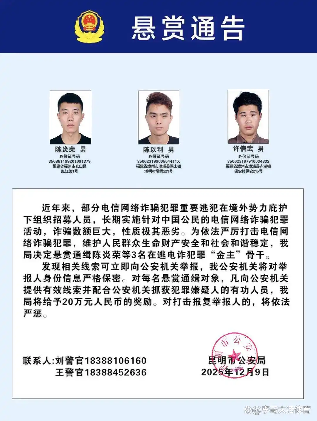 昆明市公安局悬赏通缉陈炎荣等3名在逃电诈犯罪